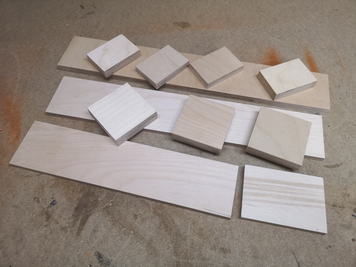 Mając zgromadzone niezbędne materiały przystąpiłem do budowy. W pierwszej kolejności trzy kwadratowe kawałki sklejki o boku 7cm zostały że sobą sklejone klejem do drewna.