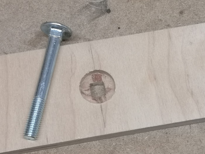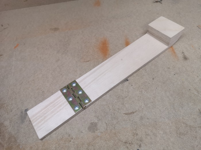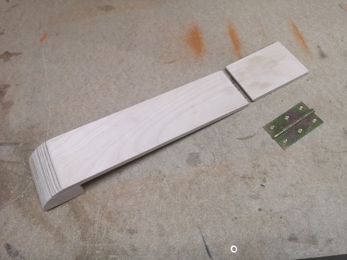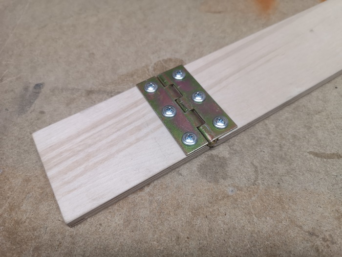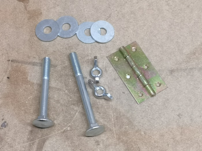 Oprócz sklejki zaopatrzyłem się w dwie śruby zamkowe M10 z nakrętkami motylkowymi, oraz zawias taśmowy.