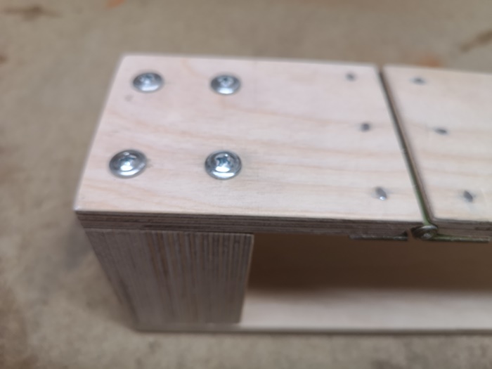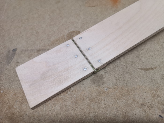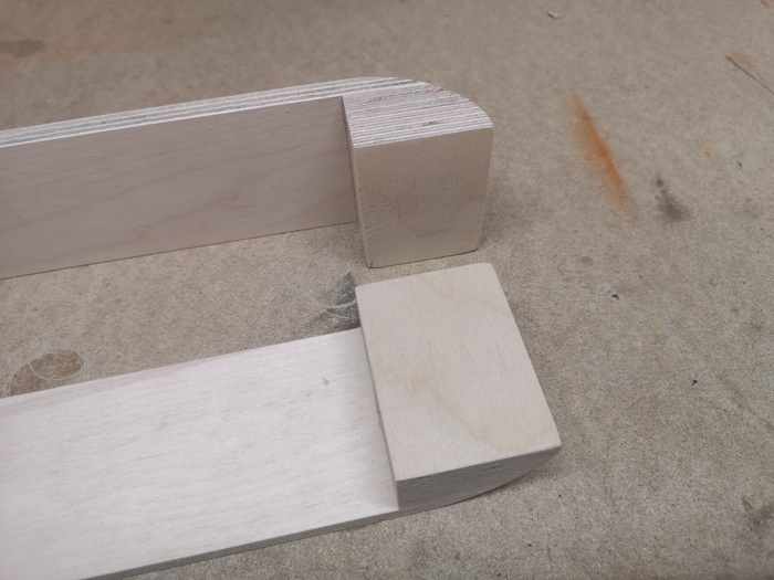 Następnie na jednym z końców dłuższej sklejki przykleiłem mniejszy klocek. Z drugą sklejką postąpiłem w ten sam sposób.