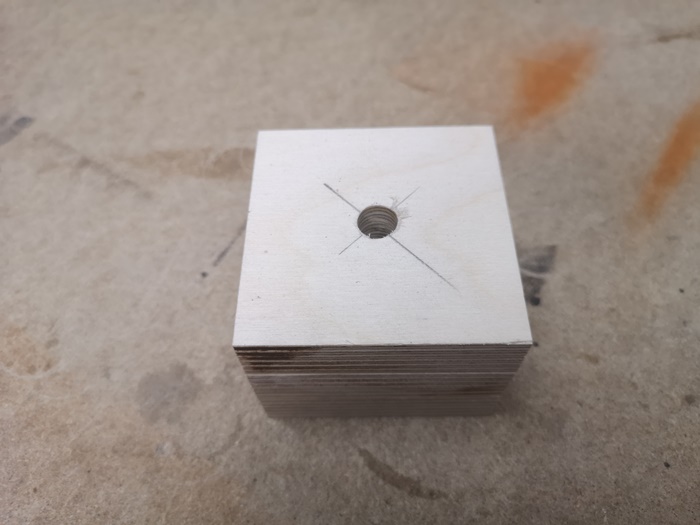 Tym sposobem uzyskałem klocek o wysokości około 6 cm. w którym na środku jednego z większych boków wywierciłem otwór pod śrubę,